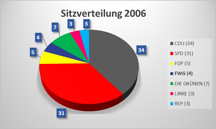 Die Freie Wählergemeinschaft Main-Kinzig-Kreis (FWG) schafften es Anfangs mit knapp 4,9 % nicht über die damalige fünf Prozenthürde zu kommen um in das Kreisparlament einzuziehen.