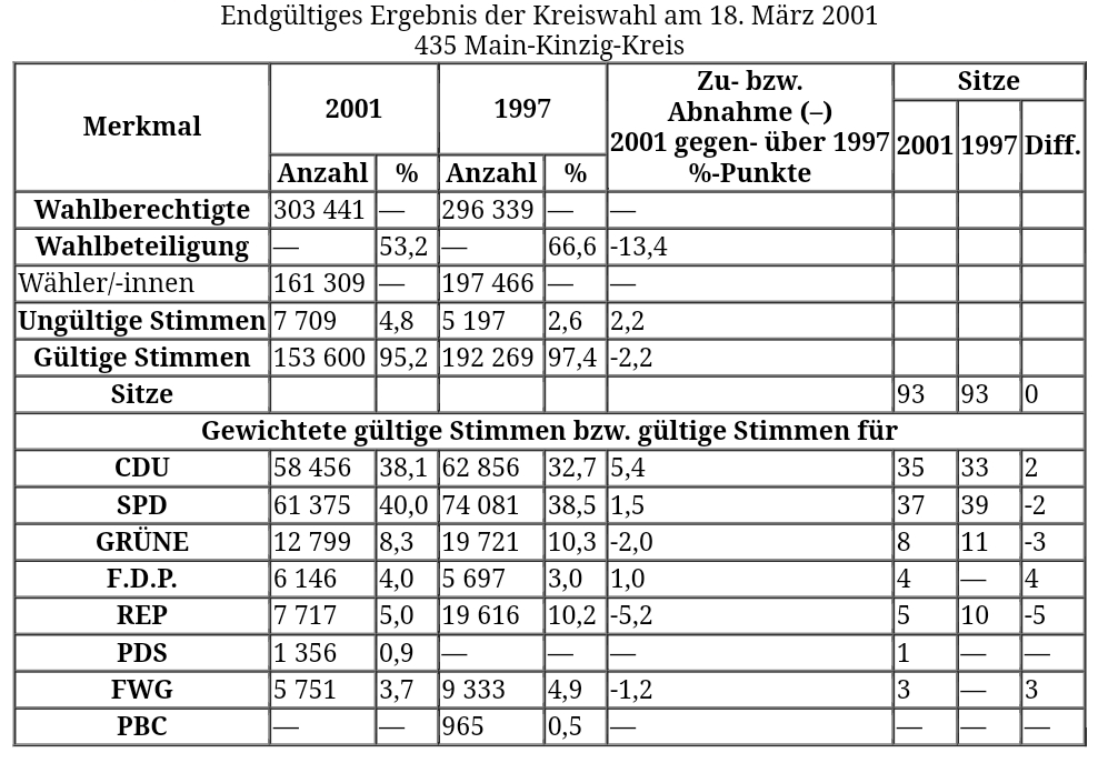 | Sitzzuteilung Kreiswahl 2016 Main-Kinzig-Kreis nach 423 von 423 Wahlbezirken | |||
